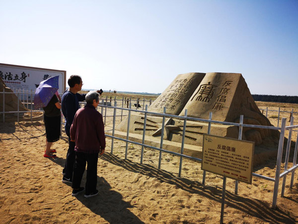 图为群众在反腐倡廉沙雕展前参观