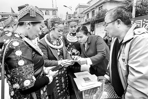 图为贵州省黄平县纪检监察干部指导群众使用民生资金微信公众号查询民生资金发放情况。