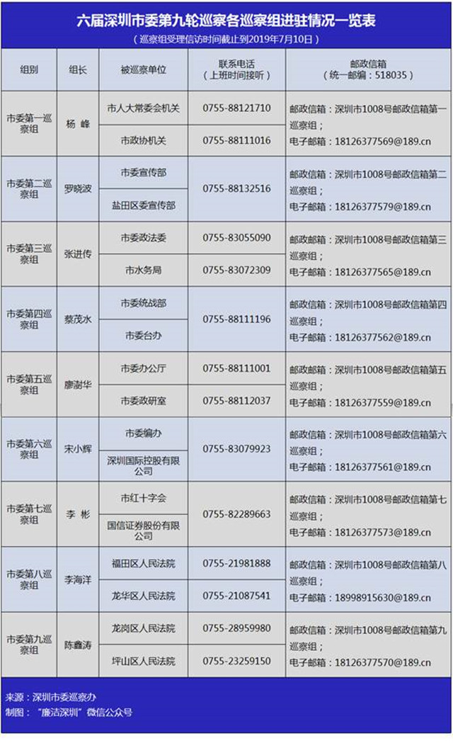 六届深圳市委第九轮巡察于5月中旬启动,本轮巡察组建9个巡察组,对市委办公厅、市委宣传部、市委统战部、市委政法委、市委政研室、市委编办、市委台办、市人大常委会机关、市政协机关、市红十字会、深圳国际控股有限公司、国信证券股份有限公司、福田区人民法院、龙岗区人民法院、龙华区人民法院、坪山区人民法院16个单位党组织领导班子及其成员(不含省管干部)开展常规巡察,对市水务局党组领导班子及其成员开展巡察“回头看”暨作风建设巡察,对盐田区委宣传部提级开展巡察。日前,深圳市委9个巡察组已陆续进驻被巡察单位并召开动员会,巡察监督工作全面展开。