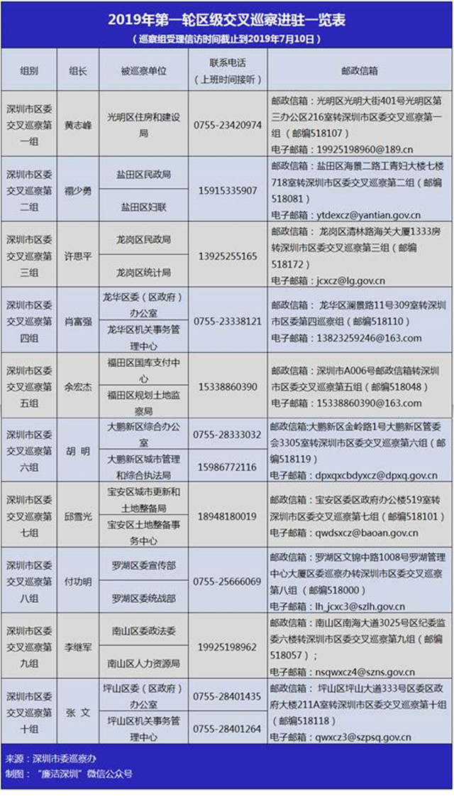 与此同时,2019年第一轮区级交叉巡察与六届市委第九轮巡察同步启动,采取“推磨式”交叉巡察的方式,组建10个巡察组,分别对罗湖区委统战部、南山区委政法委、坪山区委(区政府)办公室等19个单位党组织领导班子及其成员开展异地(跨区)交叉巡察。