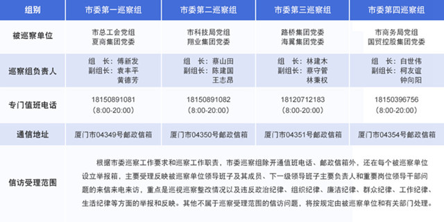 厦门:对市科技局等单位巡察"回头看" 公布联系方式 来源:中央纪委国家监委网站 时间:2019-07-25 15:52:13 点击: 次 【字体:小 大】 根据《中国共产党巡视工作条例》《关于市县党委建立巡察制度的意见》以及省委、市委相关规定和部署要求,厦门市委巡察工作领导小组研究决定,自2019年7月22日起厦门市启动十二届市委第一次巡察“回头看”工作,对市科技局党组、市商务局党组、市总工会党组、翔业集团党委、夏商集团党委、国贸控股集团党委、海翼集团党委、路桥集团党委开展巡察“回头看”,巡察时间30天左右。日前,四个巡察组已经进驻巡察。 分享到: 【打印正文】