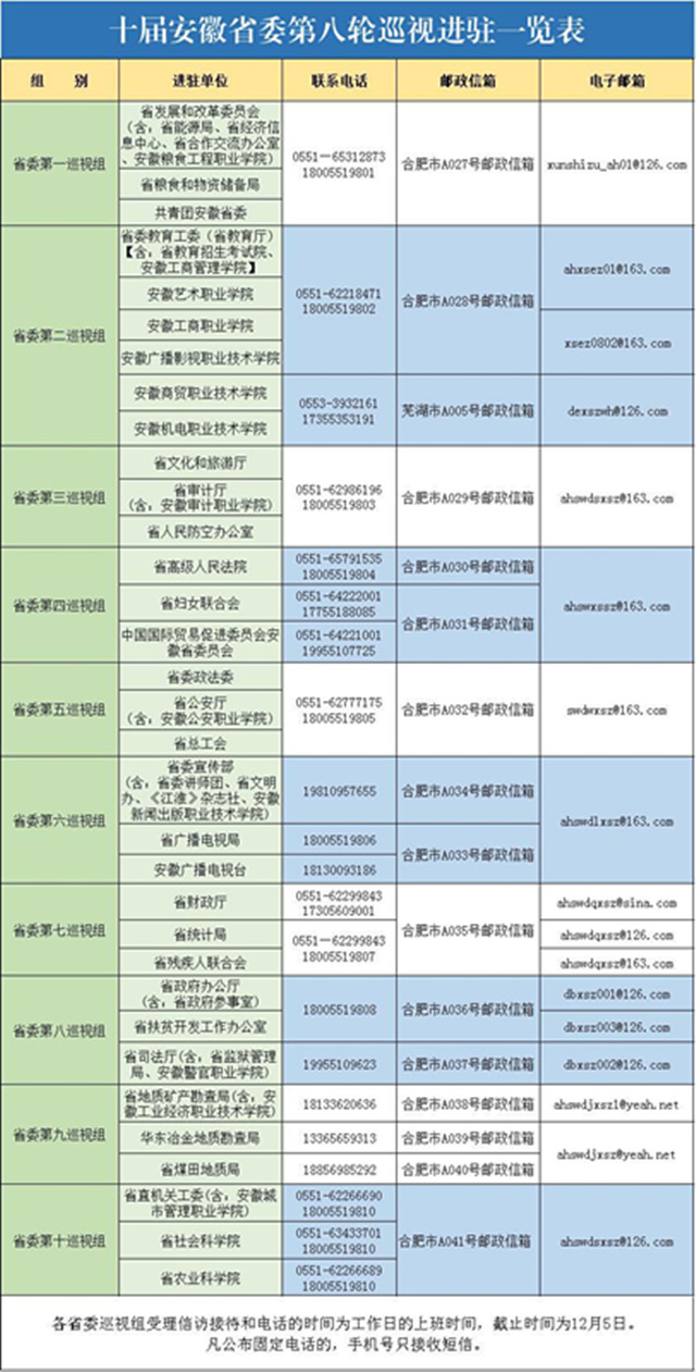 根据安徽省委统一部署,十届安徽省委第八轮巡视正式启动。本轮巡视共派出10个巡视组190名巡视干部,对28个省直单位及其所属的副厅级二级机构和高职高专开展巡视,时间为3个月,12月上旬驻点巡视结束。目前,各巡视组已全部进驻开展巡视,并公布了联系方式。