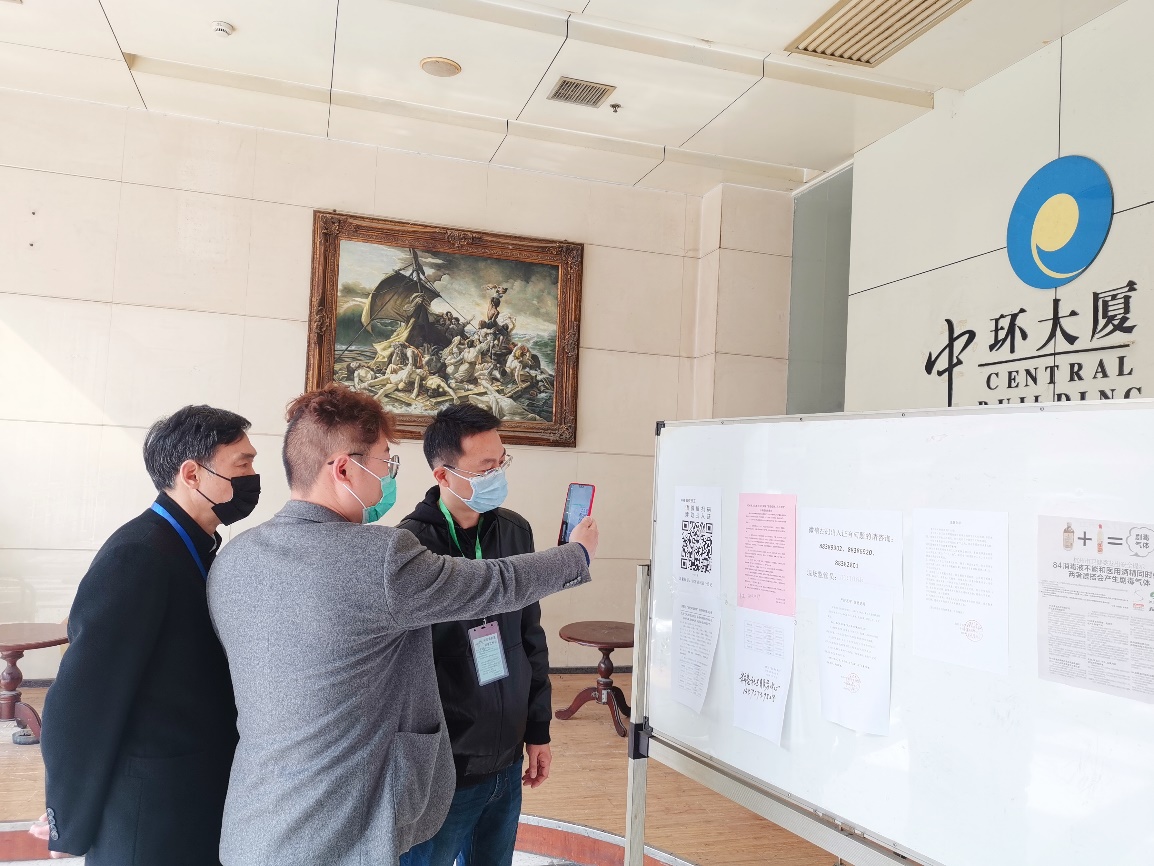 2月24日,米市巷街道纪工委来到中环大厦,一走进大楼,就看到小程序二维码张贴在一楼大厅,非常显眼,陆续有企业员工扫码出示个人通行证后被顺利放行。