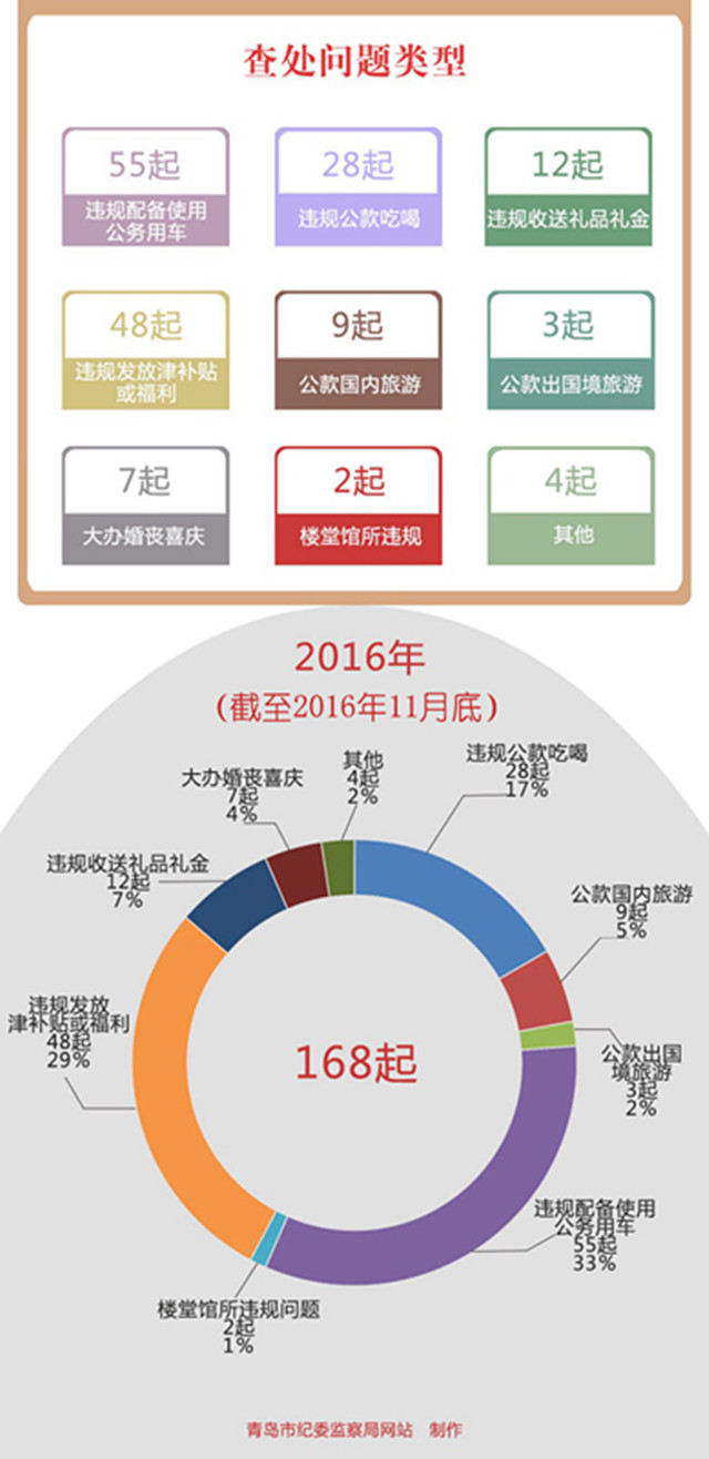 青岛:1至11月查处违反中央八项规定精神问题168起 来源:中央纪委监察部网站 作者:青岛市纪委 时间:2016-12-13 09:16:50 点击: 次 【字体:小 大】 2016年1至11月,青岛市共查处违反中央八项规定精神问题168起、处理270人,处分199人,其中违规配备使用公务用车问题55起,违规公款吃喝问题28起、违规收送礼品礼金问题12起、违规发放津补贴或福利问题48起、公款国内旅游问题9起、公款出国境旅游问题3起、大办婚丧喜庆问题7起、楼堂馆所违规问题2起,其他4起。 分享到: 【打印正文】