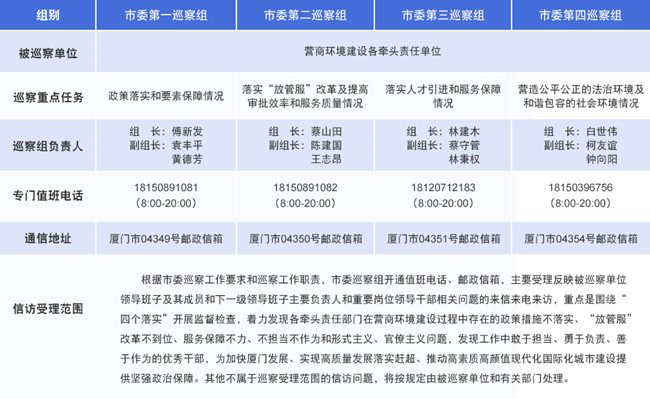 厦门对营商环境建设开展专项巡察 来源:中央纪委国家监委网站 时间:2019-05-13 14:54:40 点击: 次 【字体:小 大】 根据《中国共产党巡视工作条例》《关于市县党委建立巡察制度的意见》以及《中共厦门市委巡察工作实施办法》等规定,为贯彻落实厦门市招商大会精神,推动市委、市政府决策部署落地见效,经市委同意,自2019年5月8日起厦门市启动十二届市委第十轮第一批巡察工作,对营商环境建设开展专项巡察,巡察时间约35天左右。日前,4个巡察组已经进驻巡察。 分享到: 【打印正文】